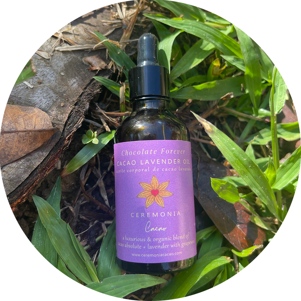 This oil is an elixir of love derived from the beans of the sacred Cacao tree and the soothing flowers of the timeless Lavender plant. This creation is made in the magical jungle of Costa Rica.