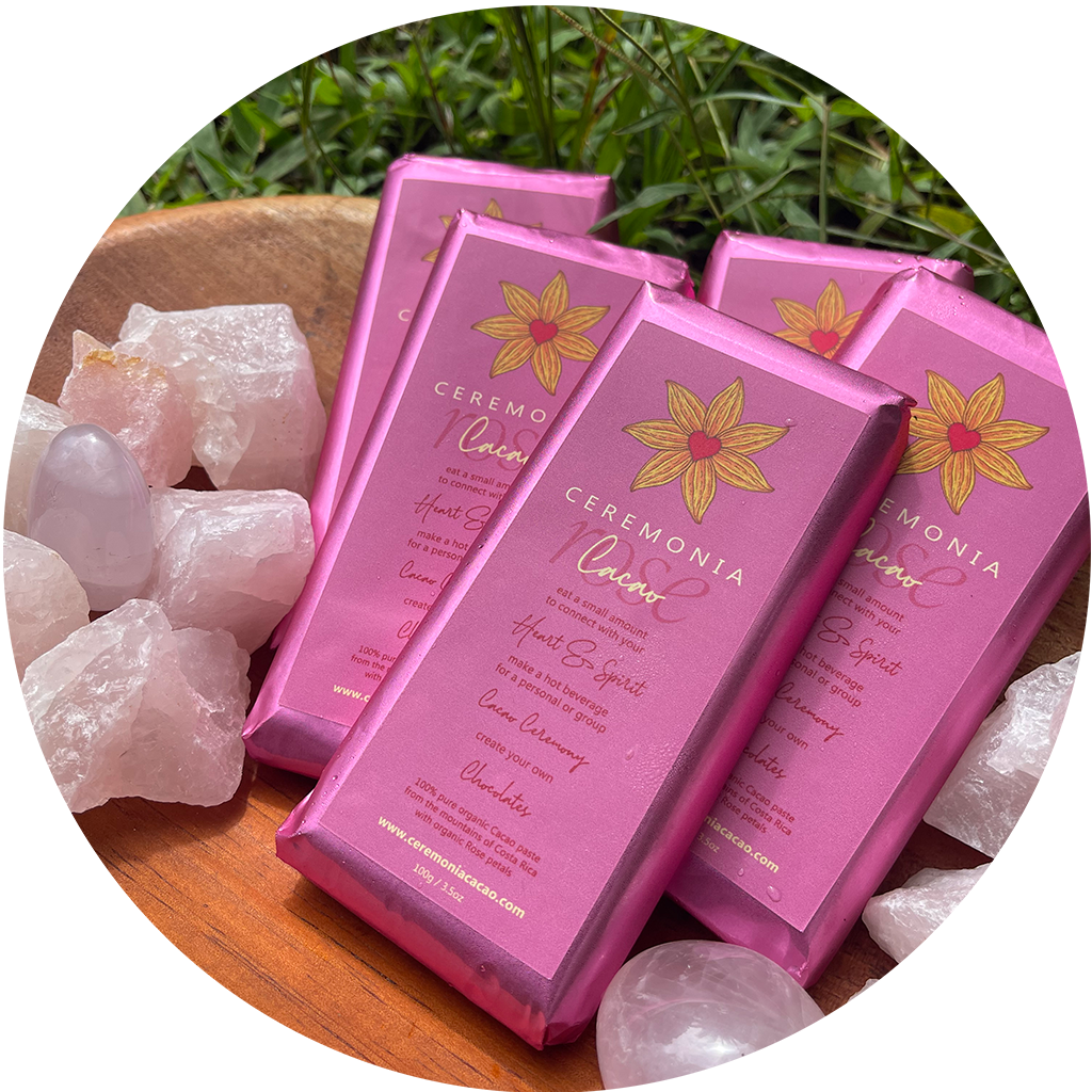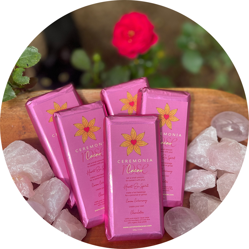 Ceremonia Cacao with Rose is pure, 100% organic ceremonial Cacao from the mountains of Costa Rica combined with organic Egyptian Rose petals.
